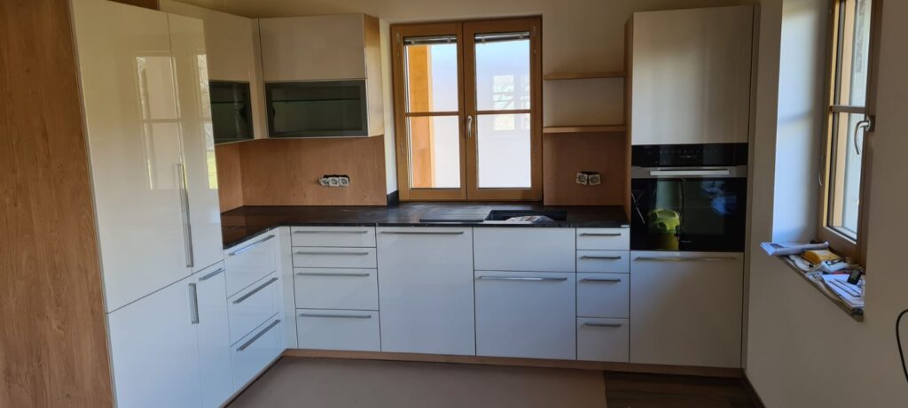 Fronten in Hochglanz-Lack Modell: La Corte Die Farbe Kashmir in Hochglanz Lack in Kombination mit dem Holzton Ulme.