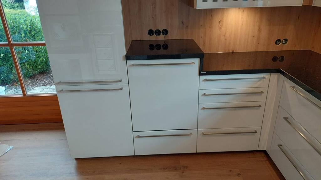 Die Hochglanz-Lack Fronten in der Farbe Fliederweiß und in Kombination mit Asteiche.