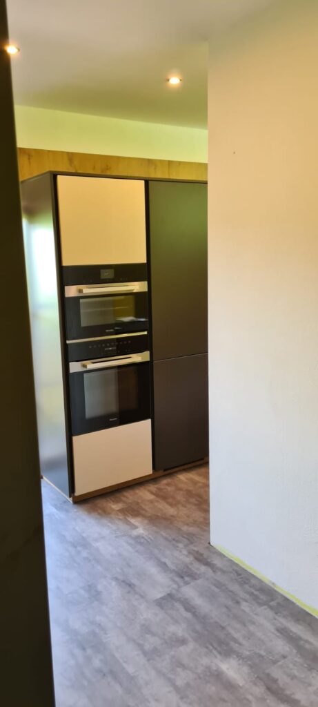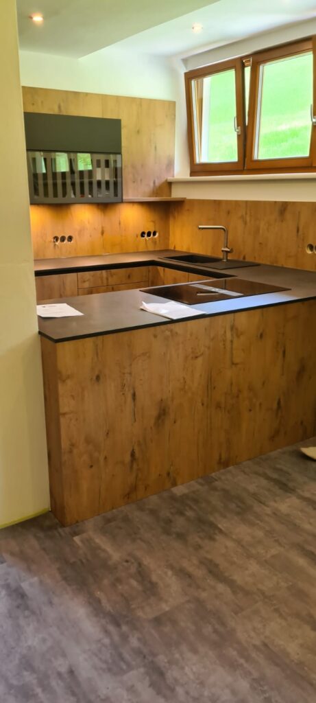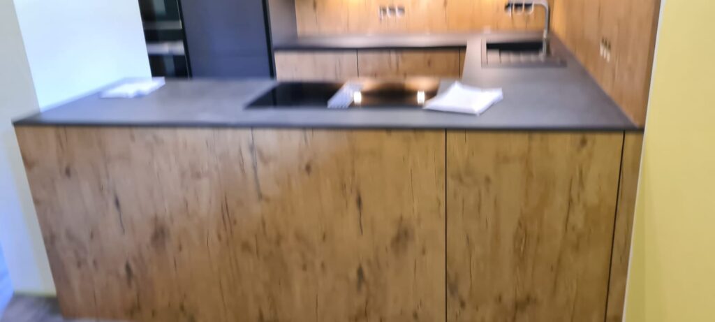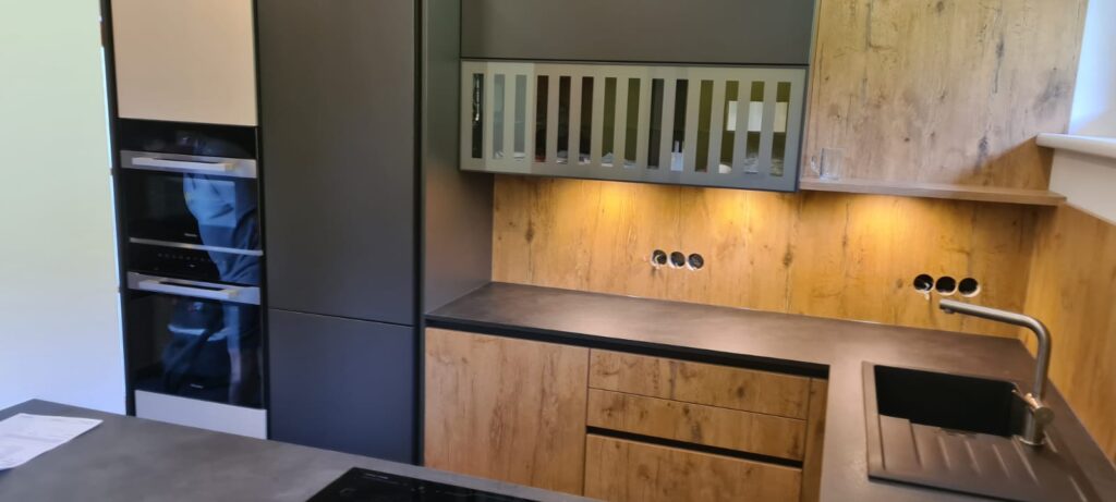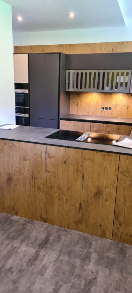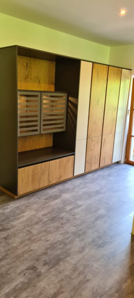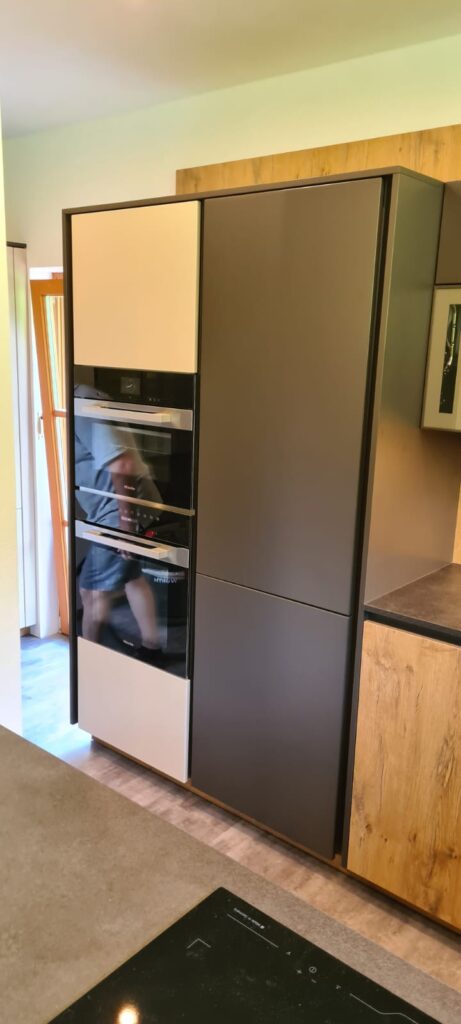 DAN-Modell Silbermond in der Farbe Cerros mit kleinen Details in der Farbe Jasmin und in Kombination mit dem Holzton Burguesa Eiche.
